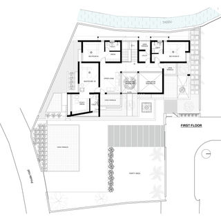 This residential project was designed with a core focus on creating private spaces while maintaining a sense of openness and continuity. Every window and opening expands into external courtyards sheltered within buffer walls adorned with intricate jali work. The thermal efficiency of the house was optimised through multiple design interventions including large overhangs, maximising openings towards the north and east while minimising openings to the south and west, a double-layered, shallow-sloped roof, and clerestory ventilation.